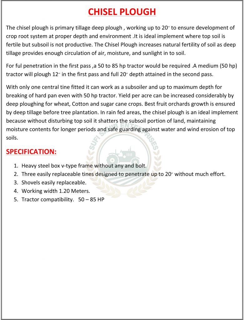 Chisel Plough is a common farming tool used to get deep tillage with limited soil disruption. The main function of chisel plough is to loosen and aerate the soil while leaving crop residue at the top of the soil. The chisel plough is used to reduce the effects of compaction and to help break up the plough pan and hardpan. Unlike many other ploughs the chisel will not invert and turn the soil.