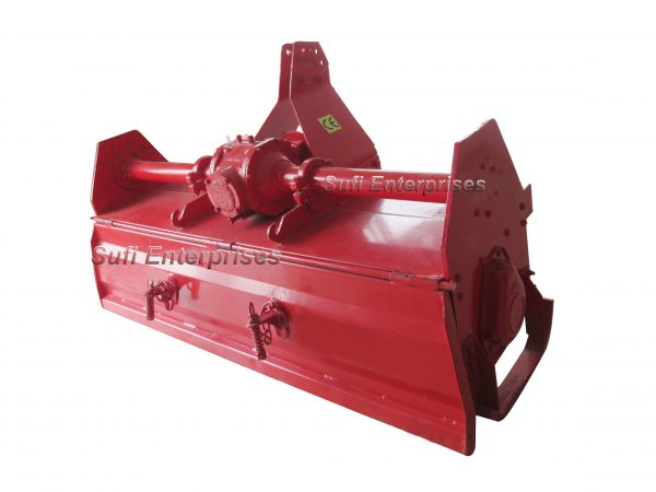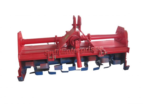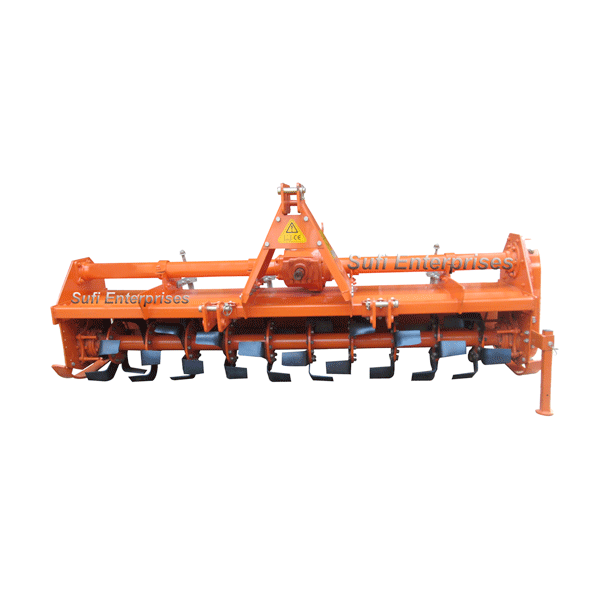 Rotavator / Rotary Tillers are composed of L-shaped tines mounted on a shaft and shrouded by a shield. The Rotavator is pulled behind a tractor while PTO of the tractor drives the shaft of rotary tiller through gear and chain arrangement. The rotating tines take the incremental bites of the soil. The soil after cutting is lifted up and rotated along with the tines and thrown back. This action makes the soil well pulverized. The cutting knives mounted on a horizontal power driven shaft operate at about 300 rpm.