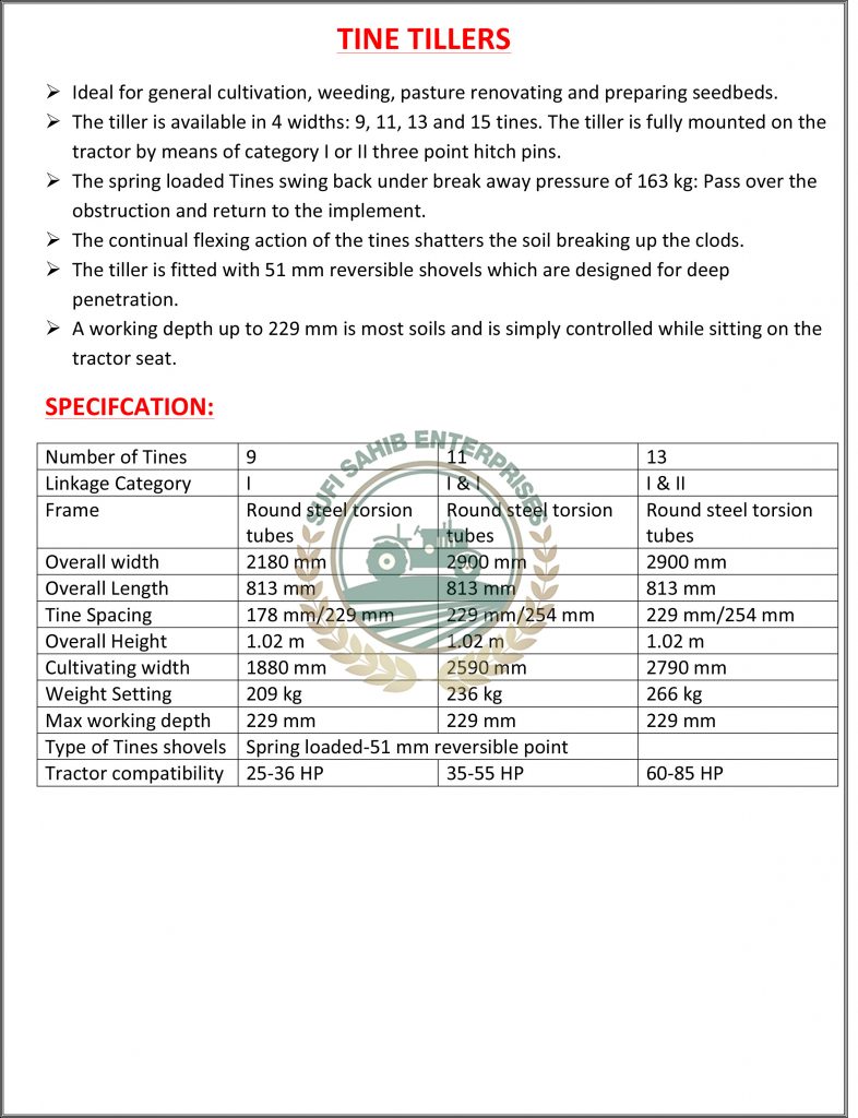 - The tiller is available in 4 widths: 9, 11, 13 and 15 tines. The tiller is fully mounted on the tractor by means of category I or II three point hitch pins.