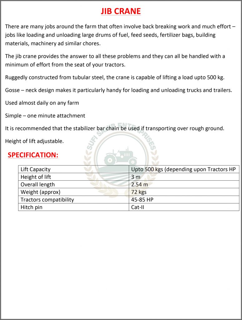 The jib crane provides the answer to all these problems and they can all be handled with a minimum of effort from the seat of your tractors.